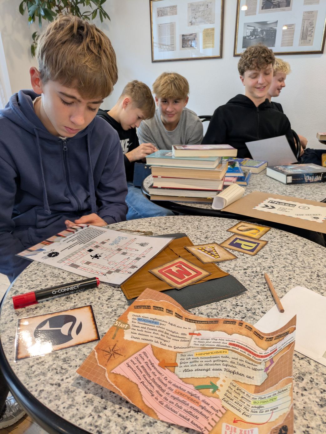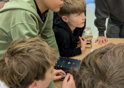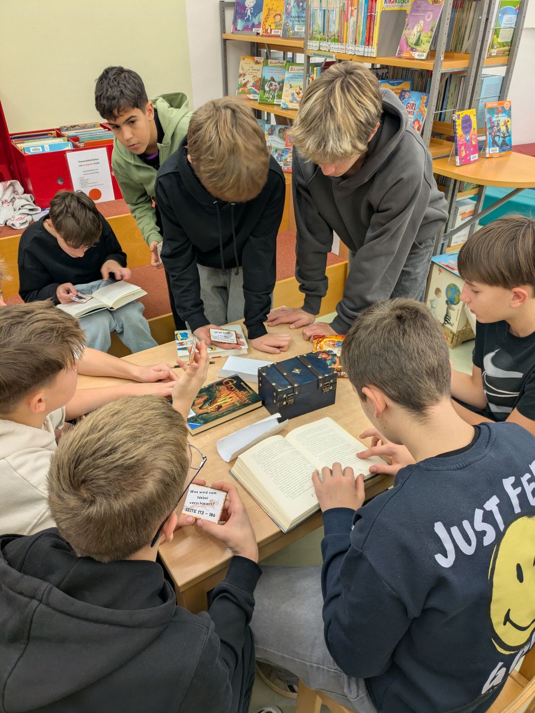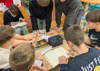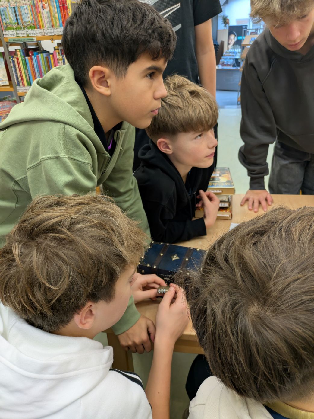 In Kleingruppen mussten die Schüler*innen zunächst die sechs passenden Bücher finden, in denen Hinweise versteckt waren. Anschließend wurden durch aufmerksames Lesen die Lösungswörter entdeckt und daraus ein dreistelliger Code generiert, mit dem eine Schatzkiste geöffnet werden konnte. Besonders gefragt waren dabei Teamarbeit, Kommunikation und ein gutes Leseverständnis – und davon hatte die 4S reichlich! Alle Gruppen konnten den Code in Rekordzeit knacken.
