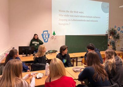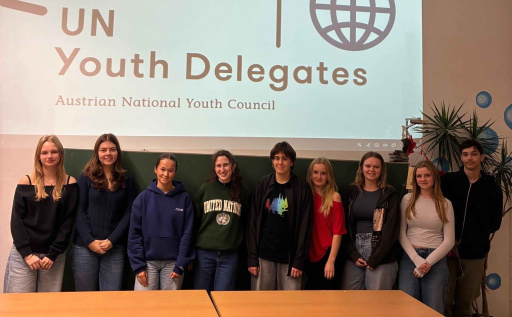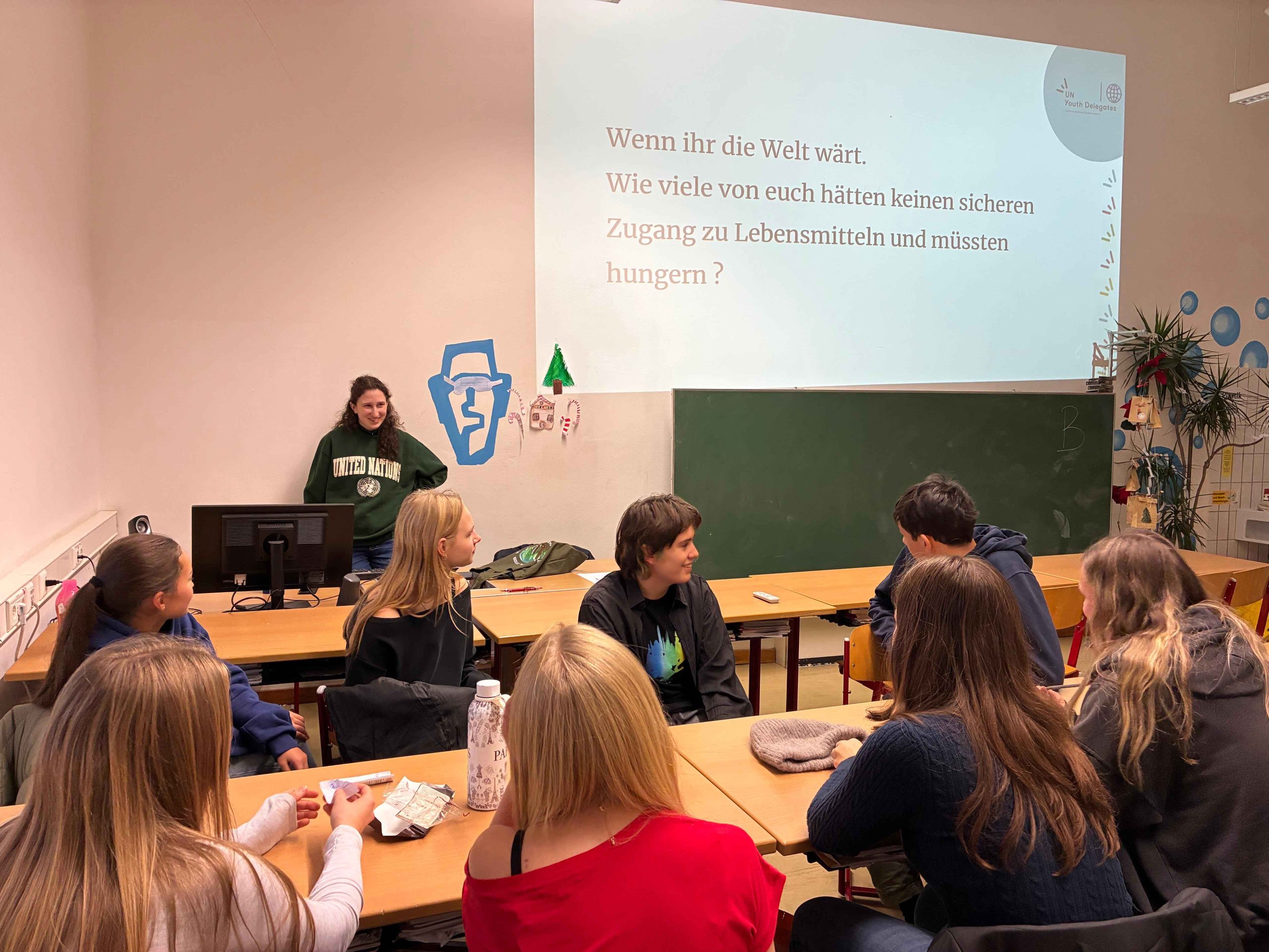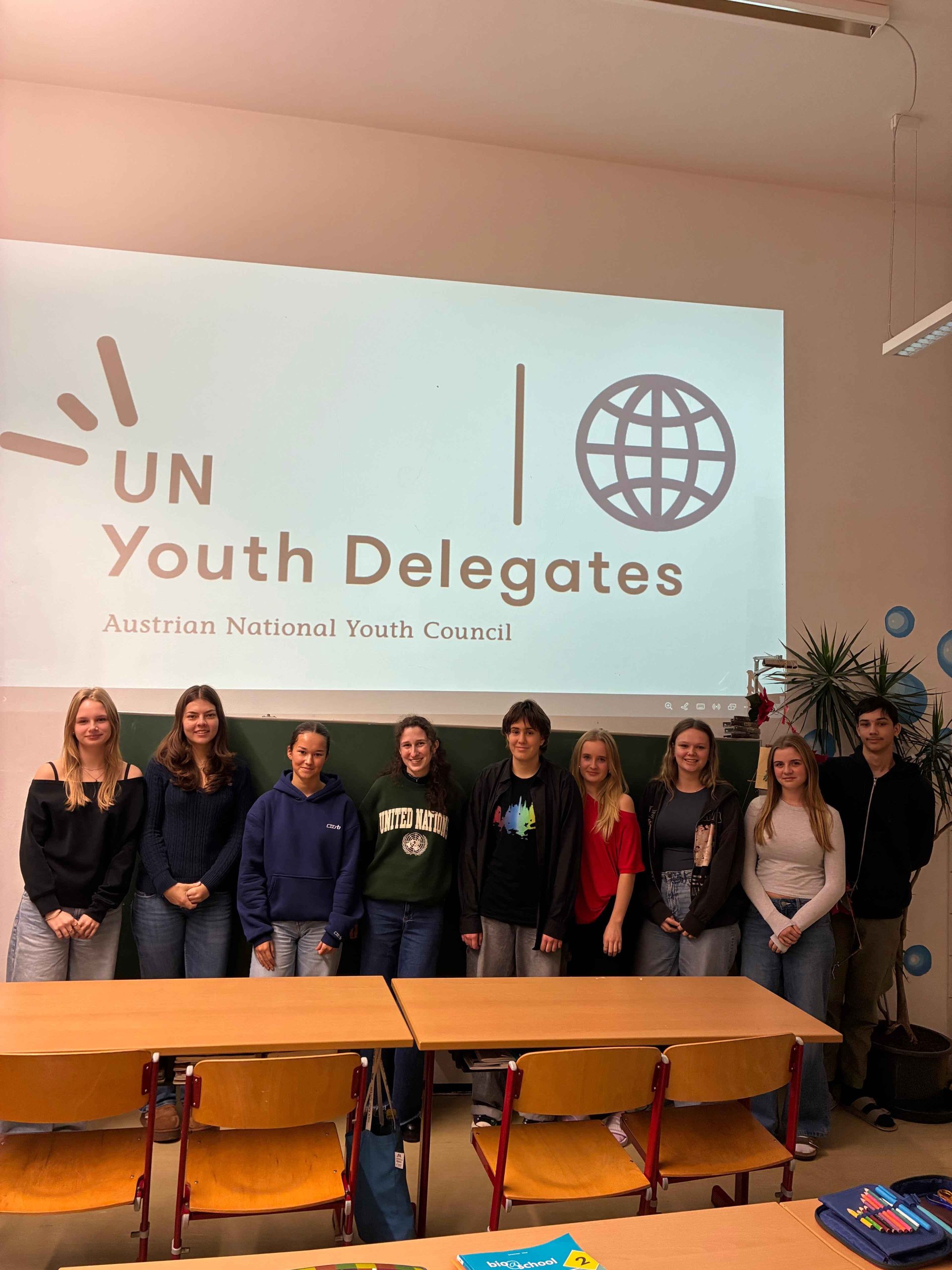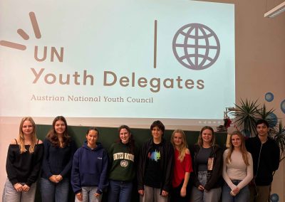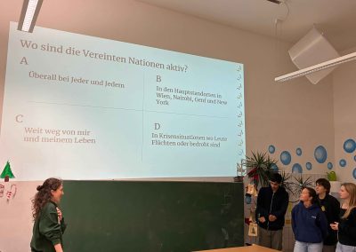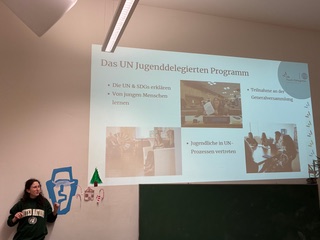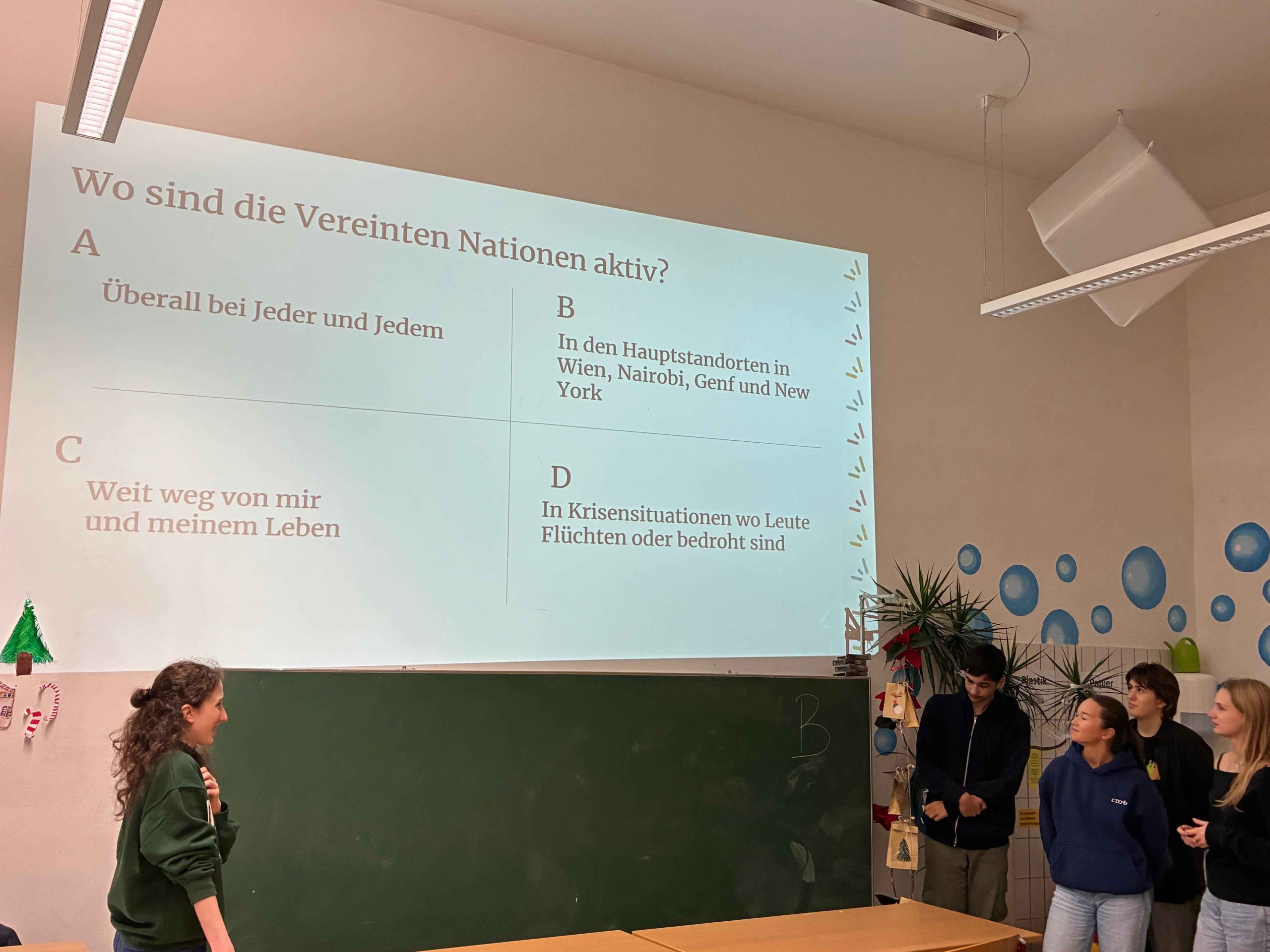 In ihrer Funktion als UN-Jugenddelegierte der österreichischen Bundesjugendvertretung (BJV) gab sie den Schüler*innen in einem interaktiven Workshop Einblicke in ihre Arbeit sowie in die Aufgaben und Ziele der Vereinten Nationen.